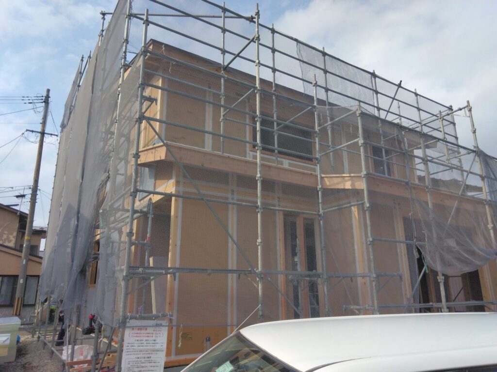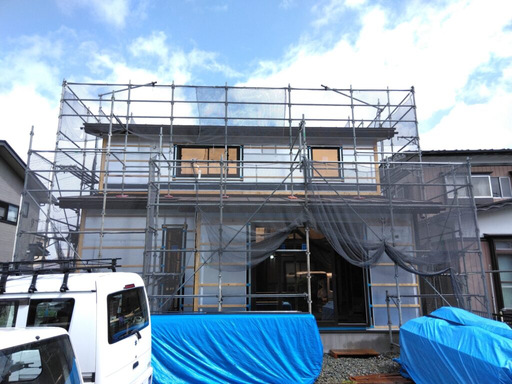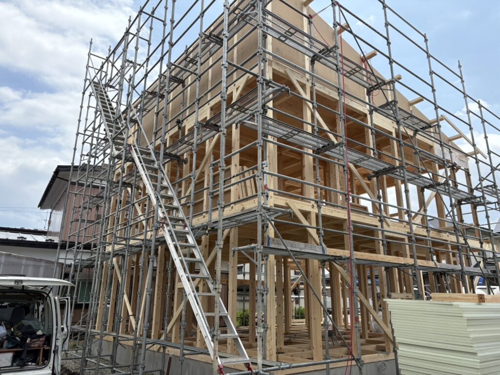 柱が建って、パネルが入り、外側の断熱材を張りました(^O^)大工さん、協力業者の皆様、暑い中ありがとうございます