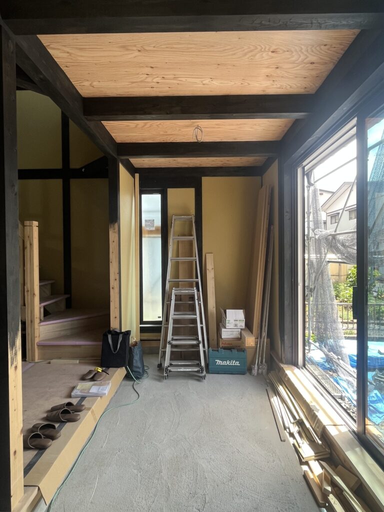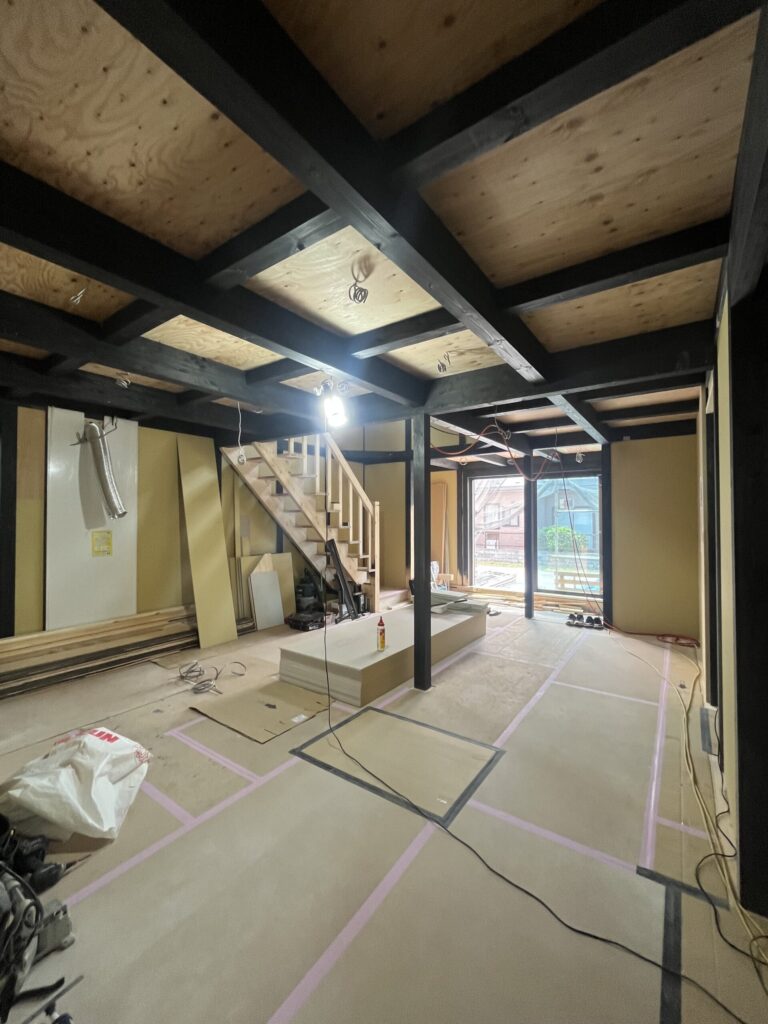 このお家は、柱をブラックの植物性塗料で塗装しました。まるで古民家のような重厚感ある雰囲気を楽しんでいただけます♪完成をどうぞお楽しみに(*’ω’*)